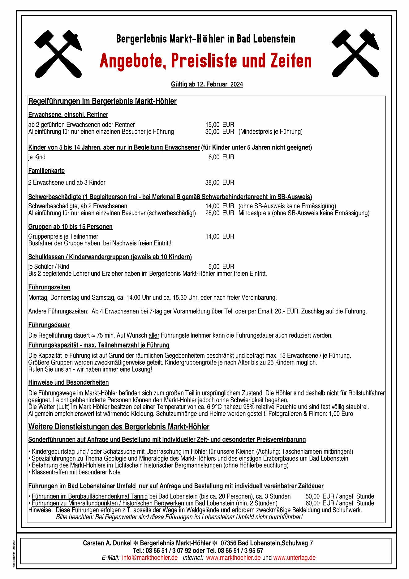 - Führungen zu anderen Terminen als zu unseren Öffnungszeiten können bei 3-tägiger Voranmeldung ab 5 erwachsenen Besuchern gern auch frei vereinbart werden. Auf den Regelpreis kommt in diesem Fall ein geringer Aufpreis von 15,00 € für die Führungsgruppe hinzu.